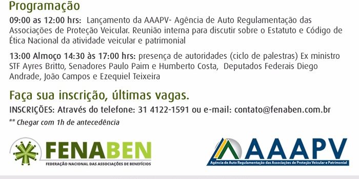 Durante o evento ocorrerá o lançamento da Agência de Auto Regulamentação das Associações de Proteção Veicular (AAAPV), que é o objeto do projeto de lei (PLS 356/2012) do senador Paulo Paim (PT-RS), e de propostas dos deputados Diego Andrade (PSD-MG), João Campos (PRB-GO), Benito Gama (PTB-BA) e Ezequiel Teixeira (PTN-RJ), que tramitam na Câmara Federal.